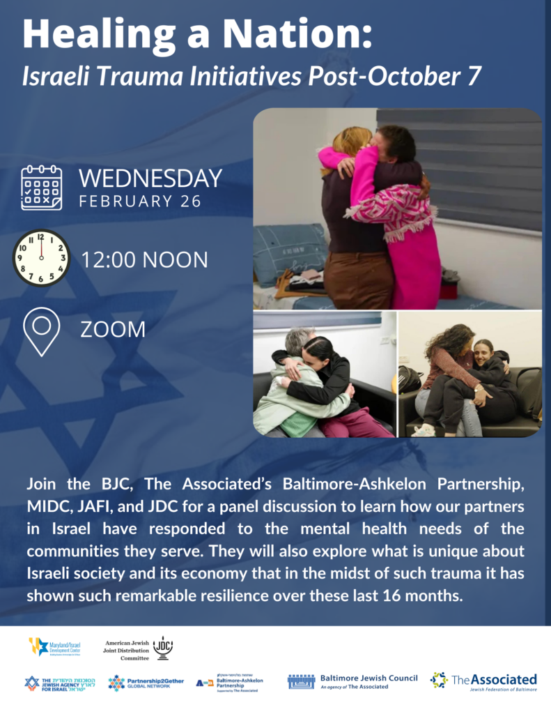 Join the Baltimore Jewish Council, The Associated’s Baltimore-Ashkelon Partnership, Maryland/Israel Development center, JAFI and JDC for a panel discussion to learn how our partners in Israel have responded to the mental health needs of the communities they serve. They will also explore what is unique about Israeli society and its economy that in the midst of such trauma it has shown such remarkable resilience over these last 16 months.